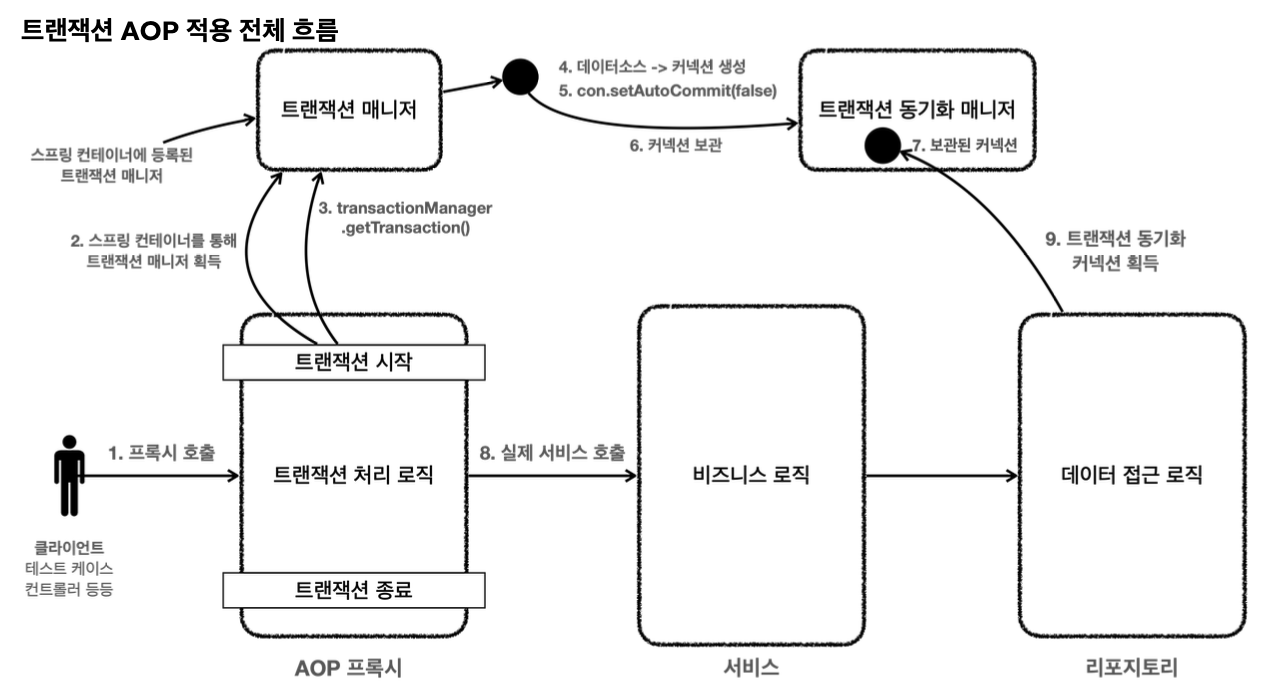 - 클라이언트의 요청이 들어오면 AOP 프록시가 트랜잭션을 시작한다.