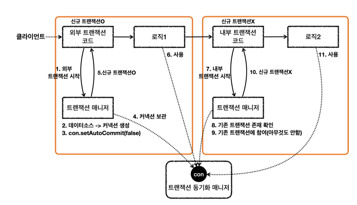 - 외부 트랜잭션: 물리 트랜잭션을 시작하고 커밋하는 역할을 담당한다.