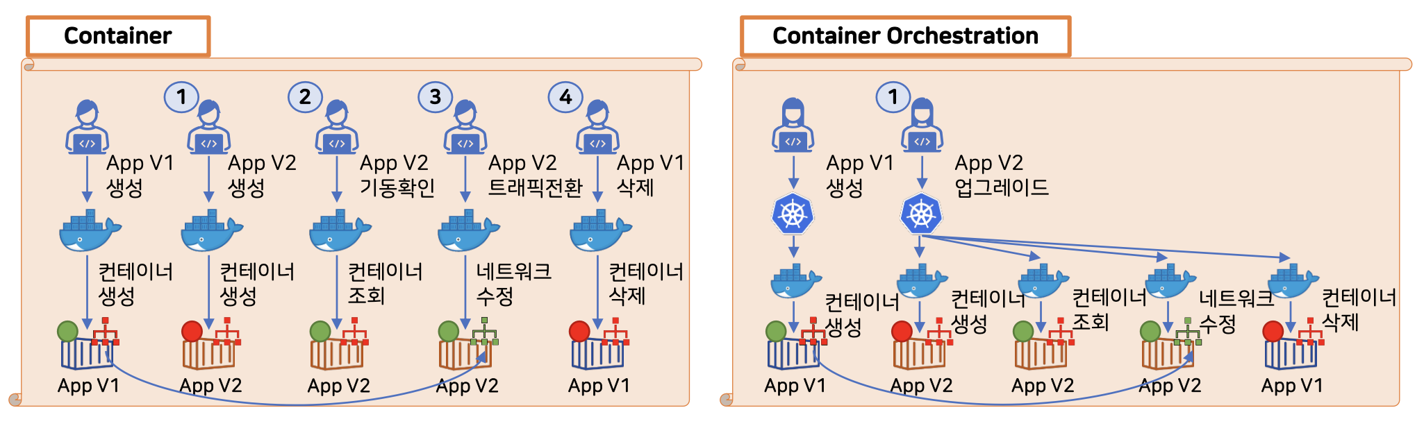 기존 Container는 새로운 버전으로 릴리즈 되면 매번 운영자가 수정해주어야 하지만, Container Orchestration은 업그레이드만 설정하면 알아서 Container Orchestration이 해결해 준다. 이것이 우리가 쿠버네티스를 배워야 하는 이유다.