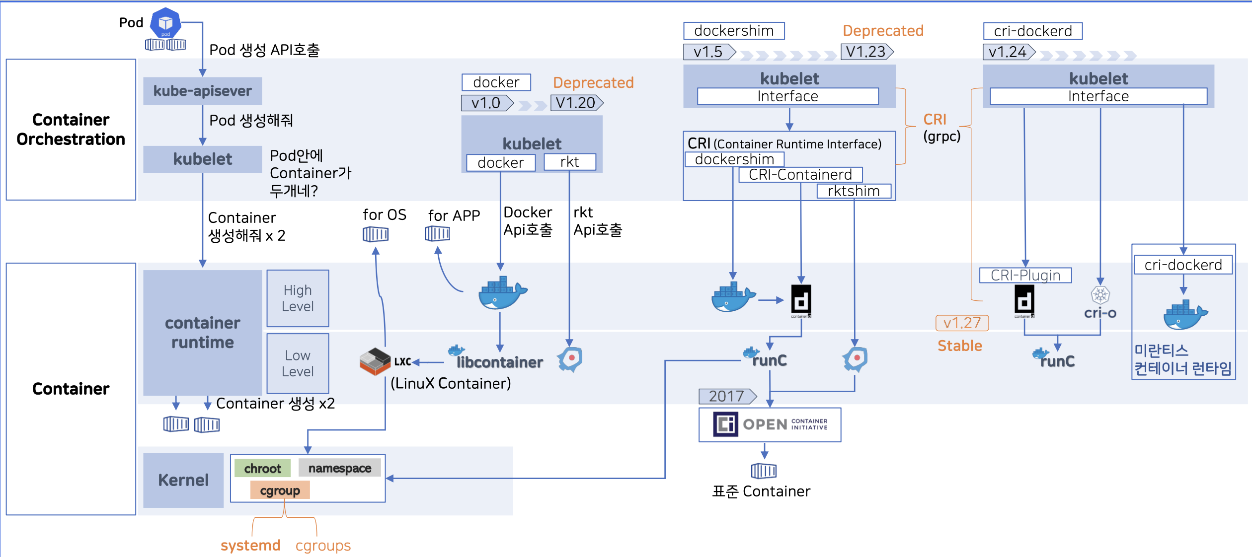 이유는 docker가 쿠버네티스의 인터페이스와 잘 맞지 않아서 나온다. docker가 만들어지고 쿠버네티스가 만들어졌지만 쿠버네티스가 표준화될 수록 docker가 걸림돌이 되는 아이러니한 상황.