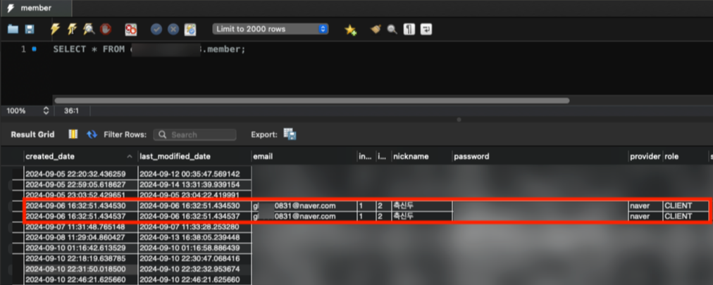데이터를 확인해보니 같은 회원이 0.000007초 차이로 저장된 것을 확인할 수 있다.