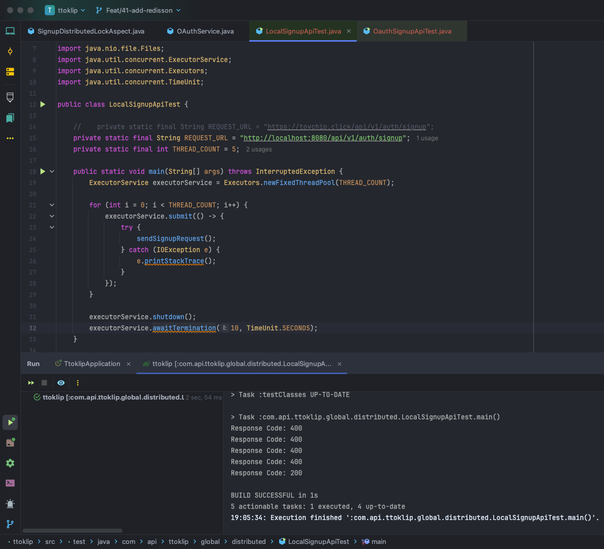 결과적으로 self-invocation 문제가 발생하여 OAuth 회원가입에서 분산락을 제대로 적용하지 못하게 되었다.
