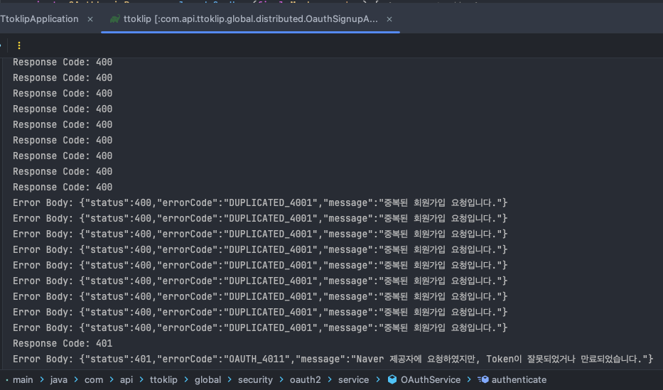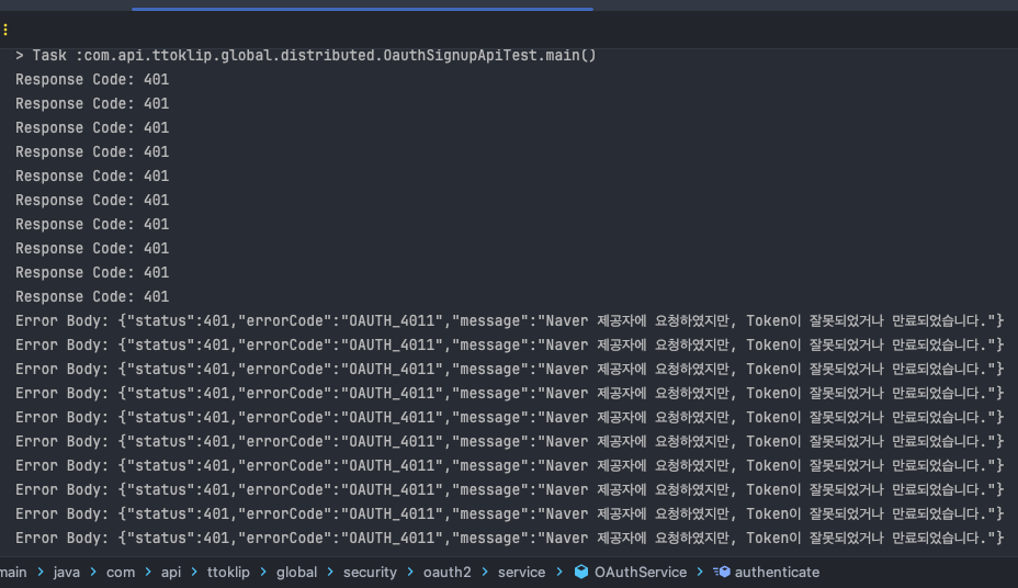 처음에 authenticate() 메서드에 분산락을 적용했을 때 OAuth 토큰이 만료된 경우에도 문제가 발생했다.