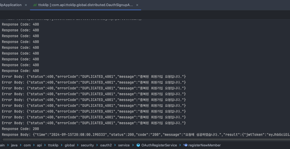 OAuthService 클래스는 OAuthRegisterService를 호출해 회원가입 처리를 하도록 수정했다.