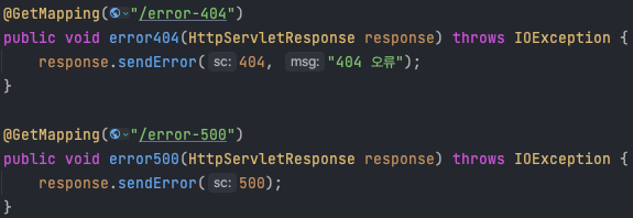 - response.sendError(Http 상태 코드, 오류 메시지) [여기서 response는 HttpServletResponse)