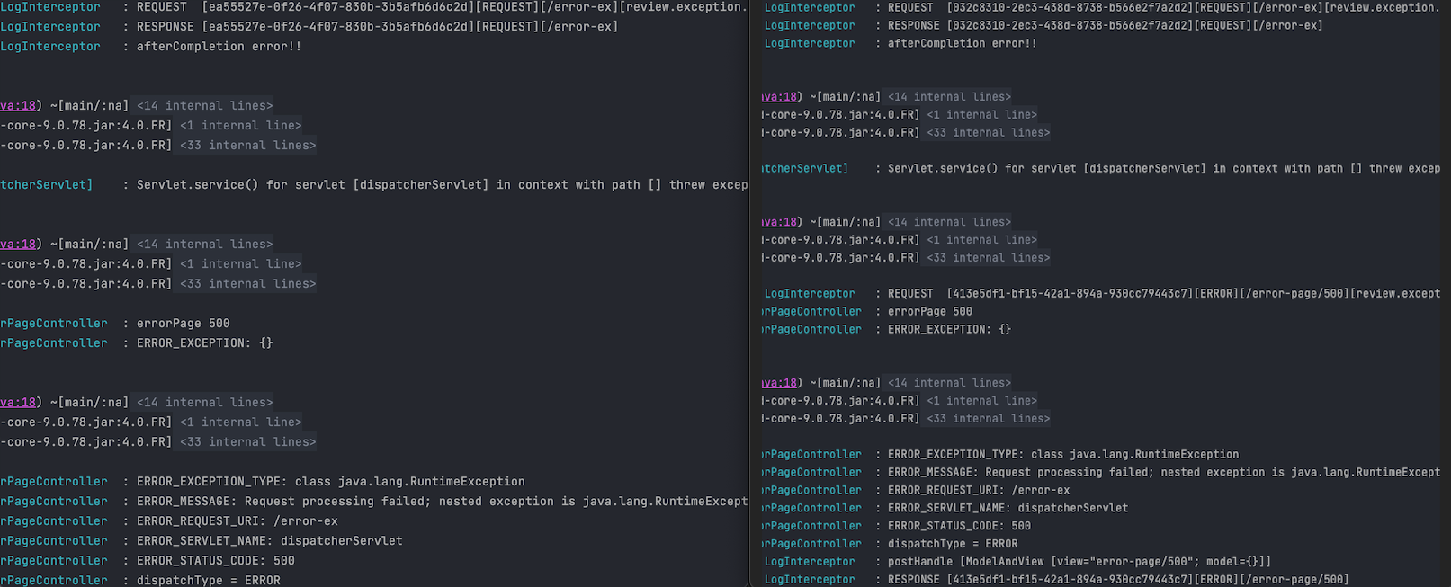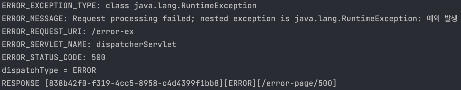 그 후 WAS에서 다시 요청이 들어올 때는 서버 내부에서 요청한 것으로, 요청 DispatcherType이 ERROR인 것을 볼 수 있으며 오류 view를 렌더링 하기 위해 errorPage 500으로 요청한다.
