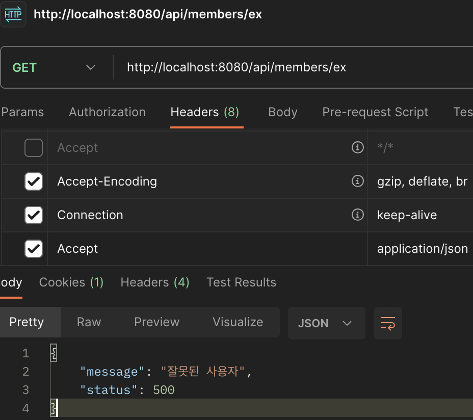 json 형태의 결과가 잘 나온다. 이제 RuntimeException을 유도해 보자.