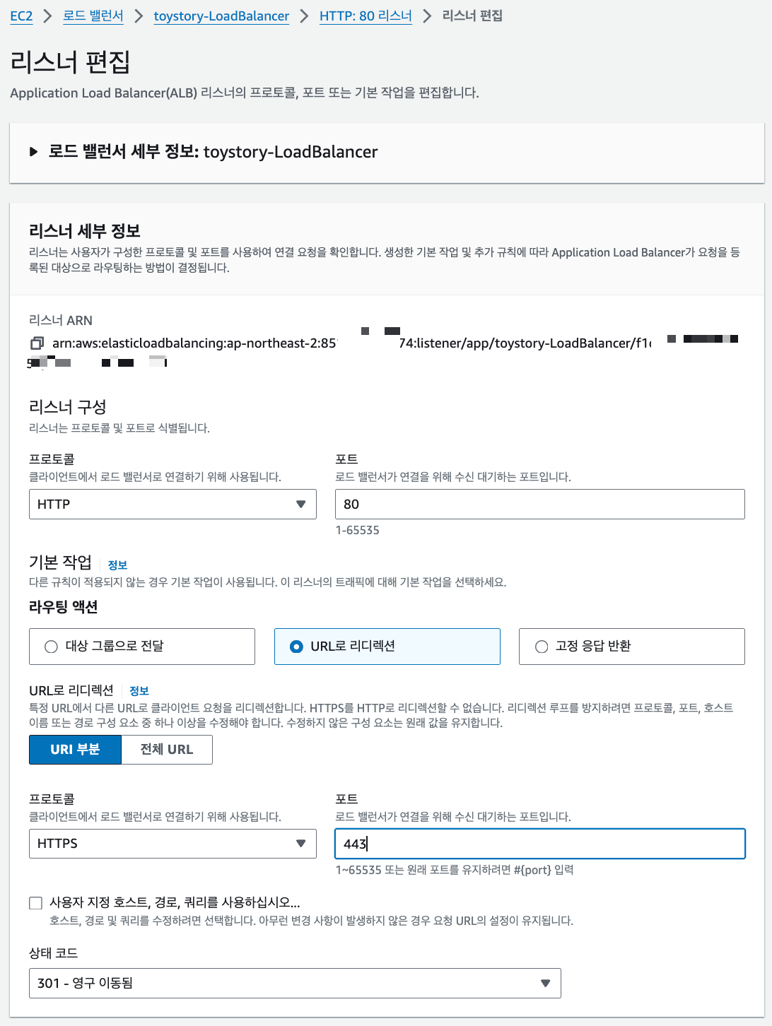 HTTPS 리스너 생성 후, HTTP 포트는 HTTPS로 리다이렉트 되도록 수정합니다.