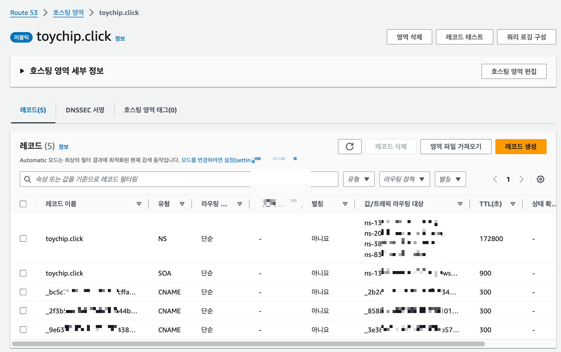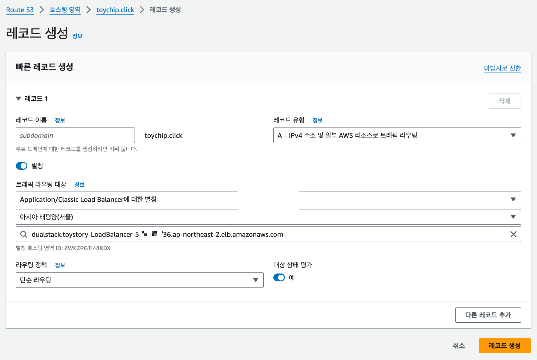 이제 Route 53에 배포된 우리의 도메인(여기서는 toychip.click)을 로드밸런서와 연결합니다.