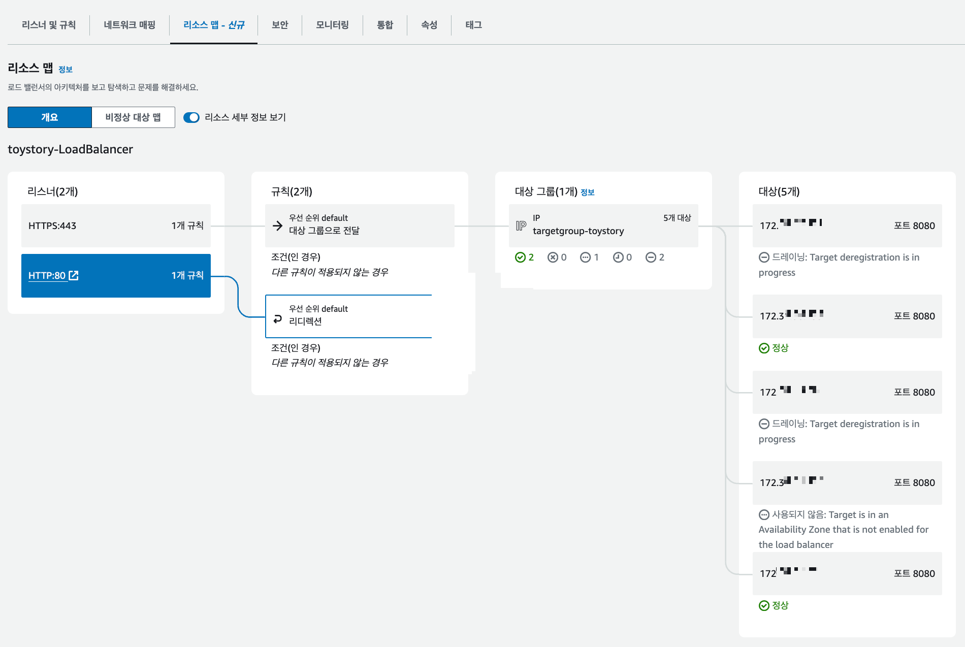 HTTP 포트는 HTTPS로 redirect 되고, HTTPS만이 대상그룹을 통해 태스크들에 전달하게 됩니다.