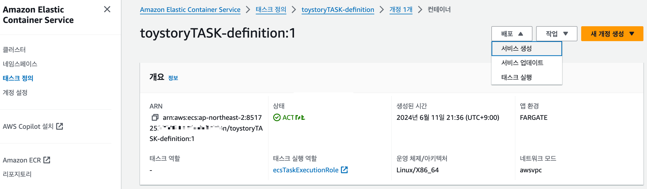 전에 설정한 태스크 정의대로 서버를 생성합시다.