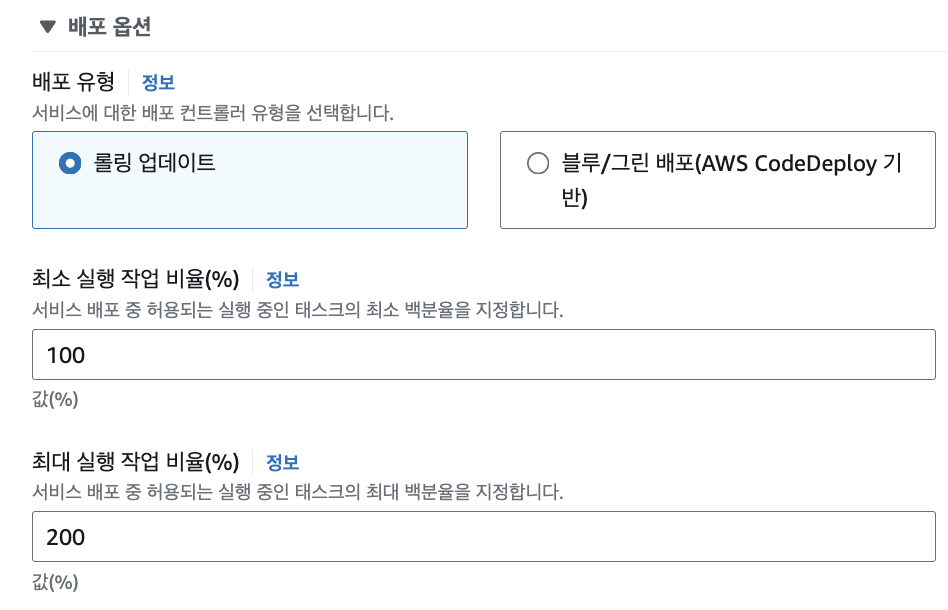 그 후 배포 옵션에서 롤링 업데이트를 선택 후 최소 3개, 최대 6개가 실행될 수 있도록 비율을 조절합니다.