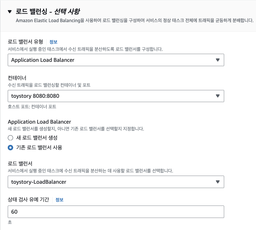 로드밸런서는 우리가 만들어뒀던 로드밸런서를 선택하고, 상태 검사 유예기간을 60초로 둡니다.