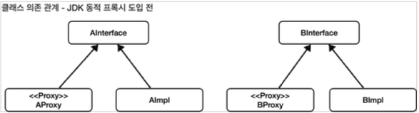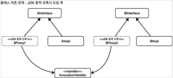 이렇게 사용한다면, 적용해야할 클래스 AImpl, BImpl 각각 프록시를 만들지 않고, JDK 동적 프록시를 사용해서 동적으로 만들었으며 TimeInvocationHandler는 공통으로 사용했다.