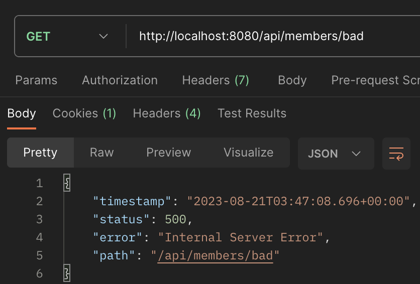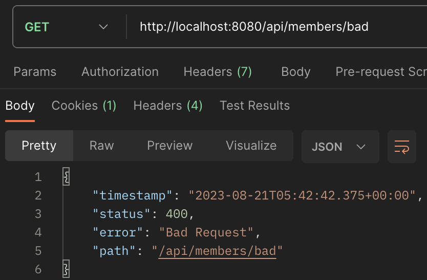 우리가 아까 'bad'가 url로 요청이 오면, IllegalArgumentException 이 발생하게 되어 if 조건문을 충족하게 되고, 400 에러와 Exception에 메시지를 응답에 담는다.