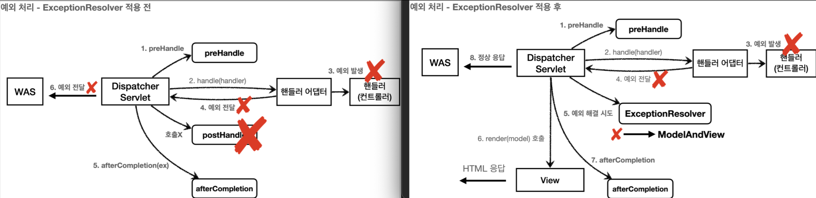 컨트롤러에 가서 Exception가 발생하는 것까지는 적용 후와 같다. 하지만 Exception가 발생했을 때 적용 전에는 postHandle을 거치지 않고 바로 afterCompletion으로 넘어간다. 그 후 Exception 전달이 되면서 오류가 나오므로, WAS는 500 에러를 내리게 된다.