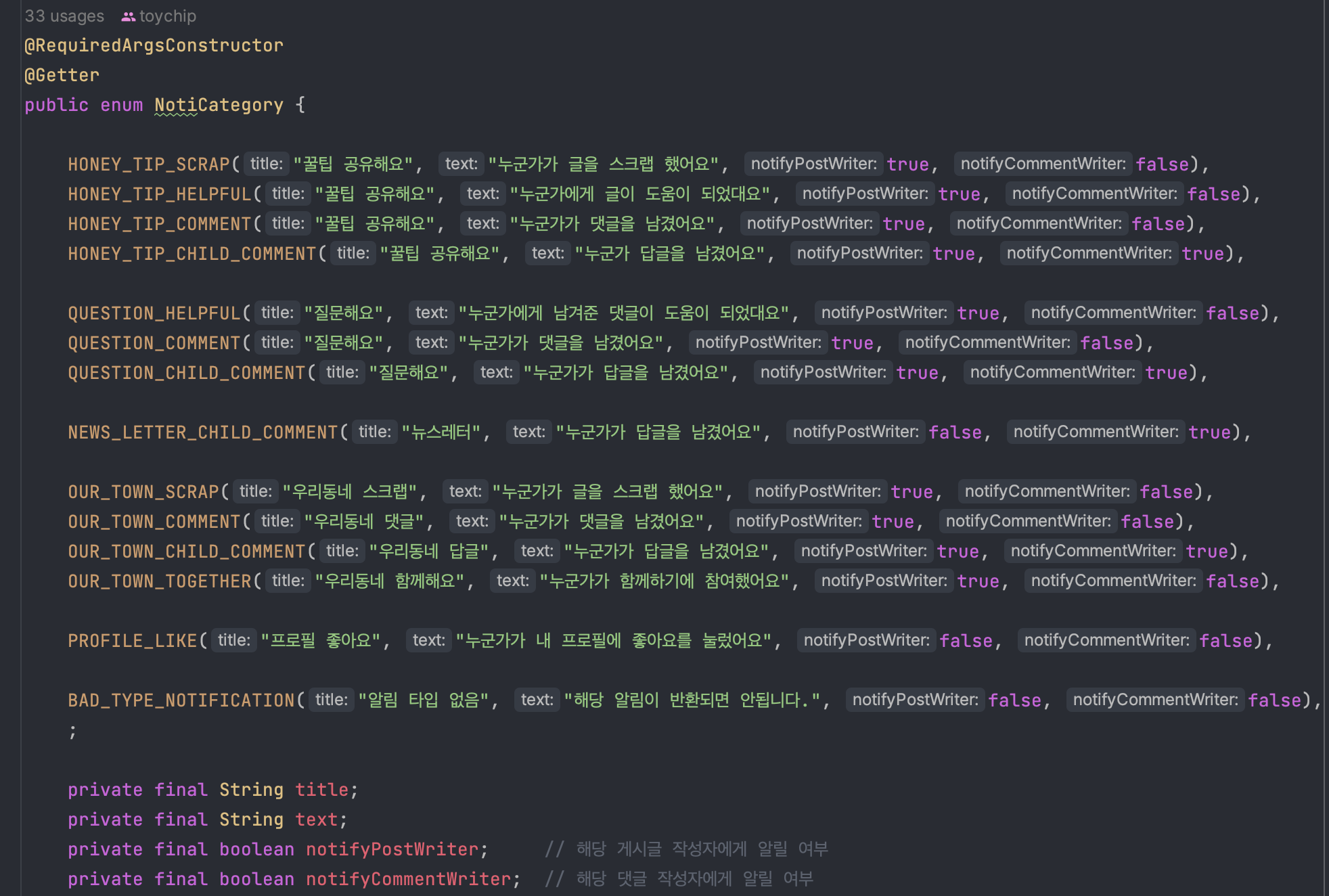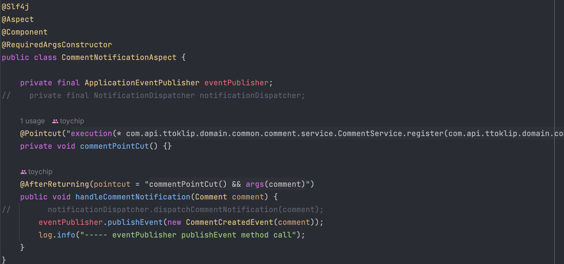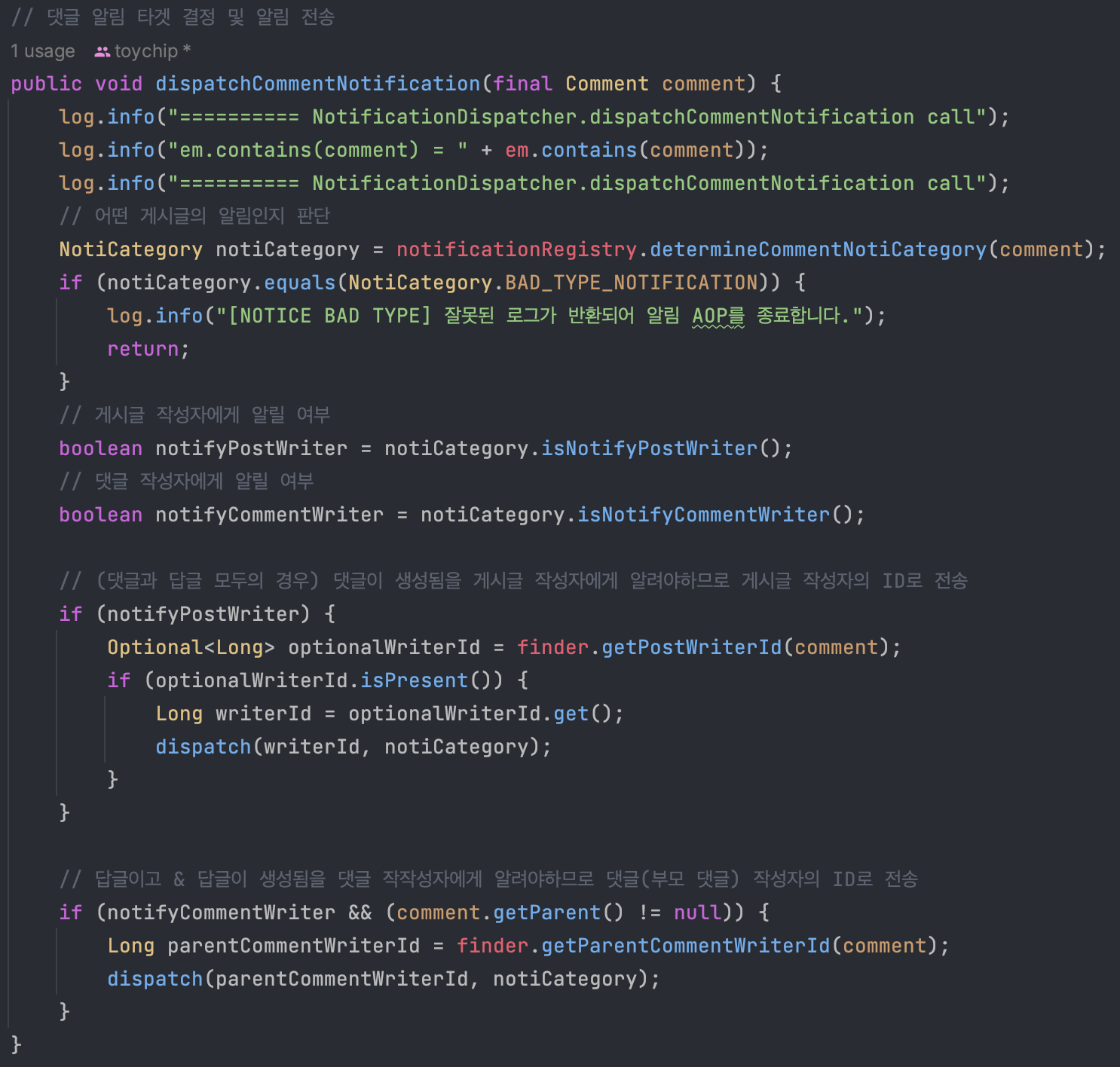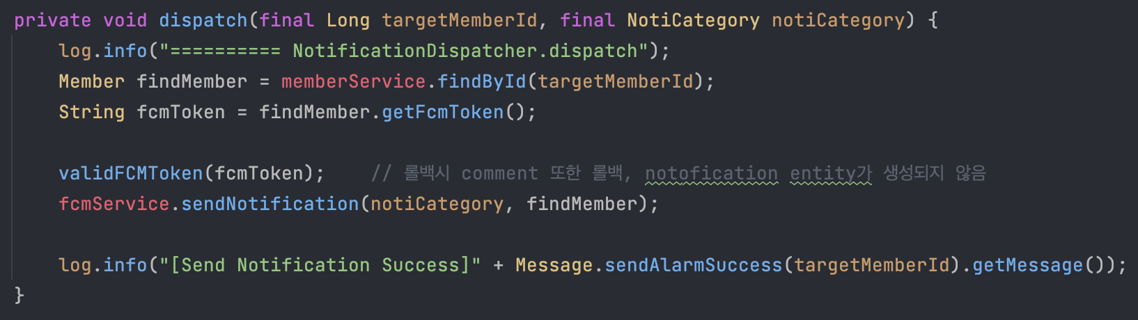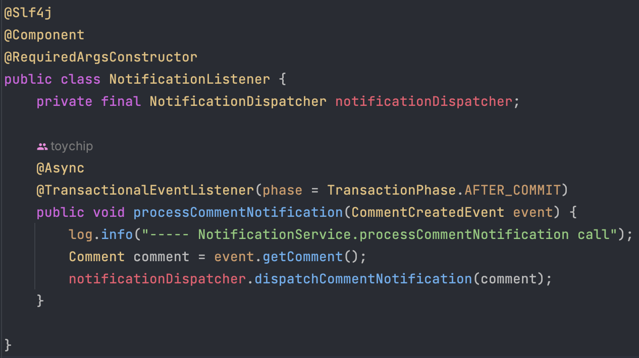 그 후 알림을 보내는 NotificationDispatcher를 AOP에서 호출했습니다.