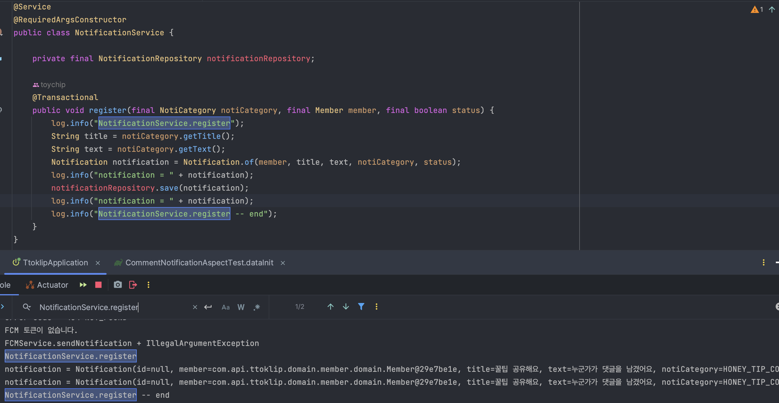 fcm service에서 sendNotification메서드에서 예외 발생시 notificationService.register는 호출은 되지만 Notification 엔티티가 생성이 되지 않습니다.