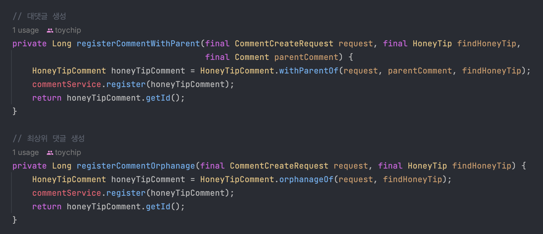 다른 댓글 서비스와 HoneyTipCommentService는 댓글 생성, 삭제시 최종적으로 CommentService 호출합니다.