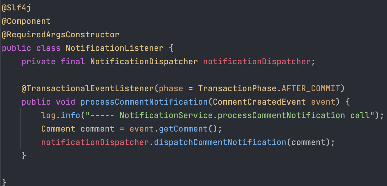 결국에 원하는 건 CommentService의 register 메서드에서 시작한 트랜잭션이 완벽히 끝난 후에 알림을 전송하고, 생성하는 로직을 분리해야합니다.