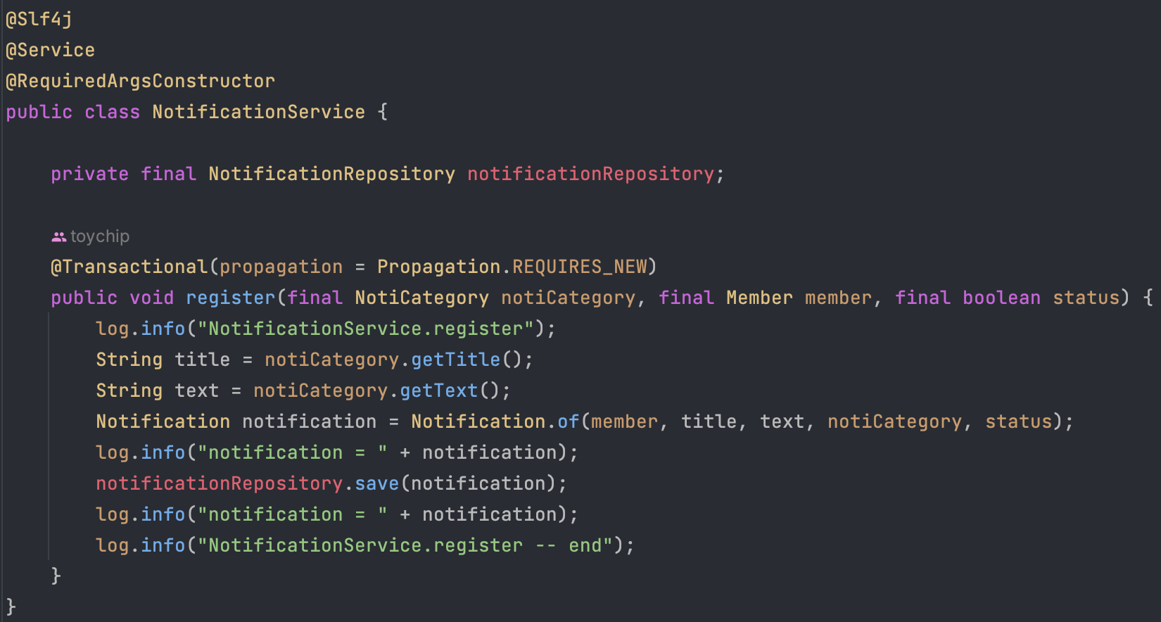 최근에 트랜잭션 전파에 대해 깊이 있게 학습하며 이전에 알림 기능을 개발할 때를 재구성 후 테스트하였고 잘못 알고 있던 점을 되짚었습니다.